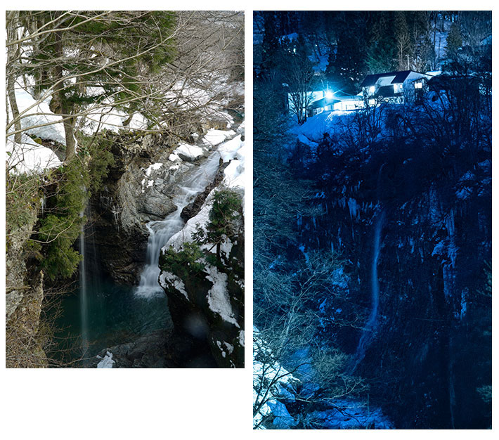 今回は小安峡の氷瀑を撮りに行くことに。十文字インターを降り増田町で小安峡方面へと右折する。川連漆器、稲庭うどんの街を抜け小安峡に入る。今日は夜の写真を撮るためとことん山のコテージを借りる。連休の初日であるためかキャンプをする人が大勢いた。部屋に入り荷物を置き最初は小安峡の大きな橋を渡り不動滝の方へ行ってみる。ここには東屋があるが雪が多く雪崩の危険があるため下へは降りていけない。不動滝の橋の上から撮った写真が左の写真である。今日は夜の氷瀑を撮る目的であったが下のほうまでは降りて行けず橋の上からの写真になったが右の写真は夜7時ごろに撮った小安峡の写真である。